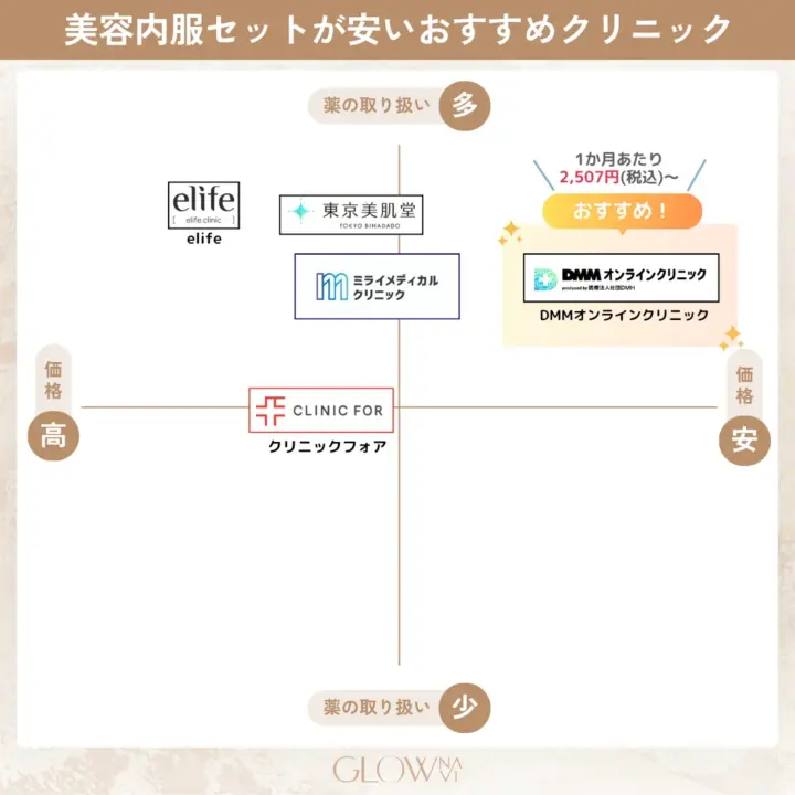 ここからは、美容内服セットをオンラインで安く処方しているおすすめクリニックを比較し、料金プラン・処方内容・特徴を詳しく紹介します。
