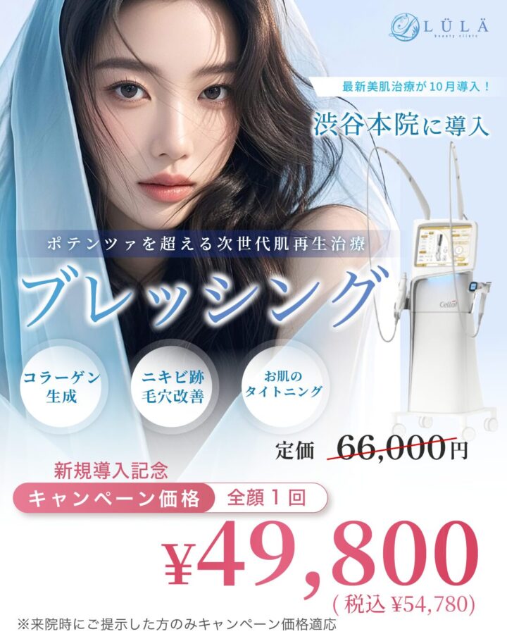 JR・京王井の頭線「渋谷駅」直結のルラ美容クリニックでは、ブレッシングの新規導入キャンペーンを実施しており、全顔1回54,780円(税込)とお得に受けられる点が魅力です。