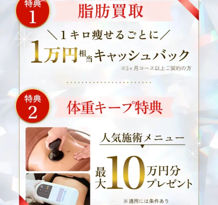 1つ目は、3ヶ月コース以上を契約した方を対象に1キロ痩せるごとに1万円相当のキャッシュバックをもらうことができます。