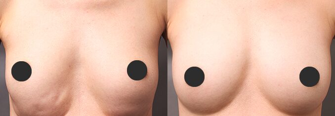 シリコンバッグでの豊胸手術後に、左右の胸の大きさや形に差が出ることがあります。主に、大胸筋下法でシリコンバッグを挿入した場合に起こりやすいトラブルです。