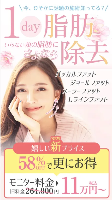 | 料金(税込) | プレミアム脂肪吸引 両頬、頬骨上、あご下:77,990円/1部位 とことん脂肪吸引 両頬:251,990円 頬骨上:179,990円 あご下:179,990円 頬+あご下:341,990円 ベイザー脂肪吸引 両頬:407,990円 頬骨上:289,990円 あご下:289,990円 |