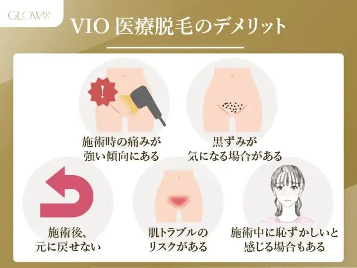 VIOラインは基本的に皮膚が薄く骨が近い部位のため、熱や痛みを感じやすいでしょう。また、毛根が強く毛量が多い方はより痛みが強くなる可能性もあります。後悔の面では、先に述べたように痛みが我慢できなかったり、施術後の肌トラブルで悩まされる方がいることがあげられます。そのため、施術後は十分な保湿を心がけましょう。